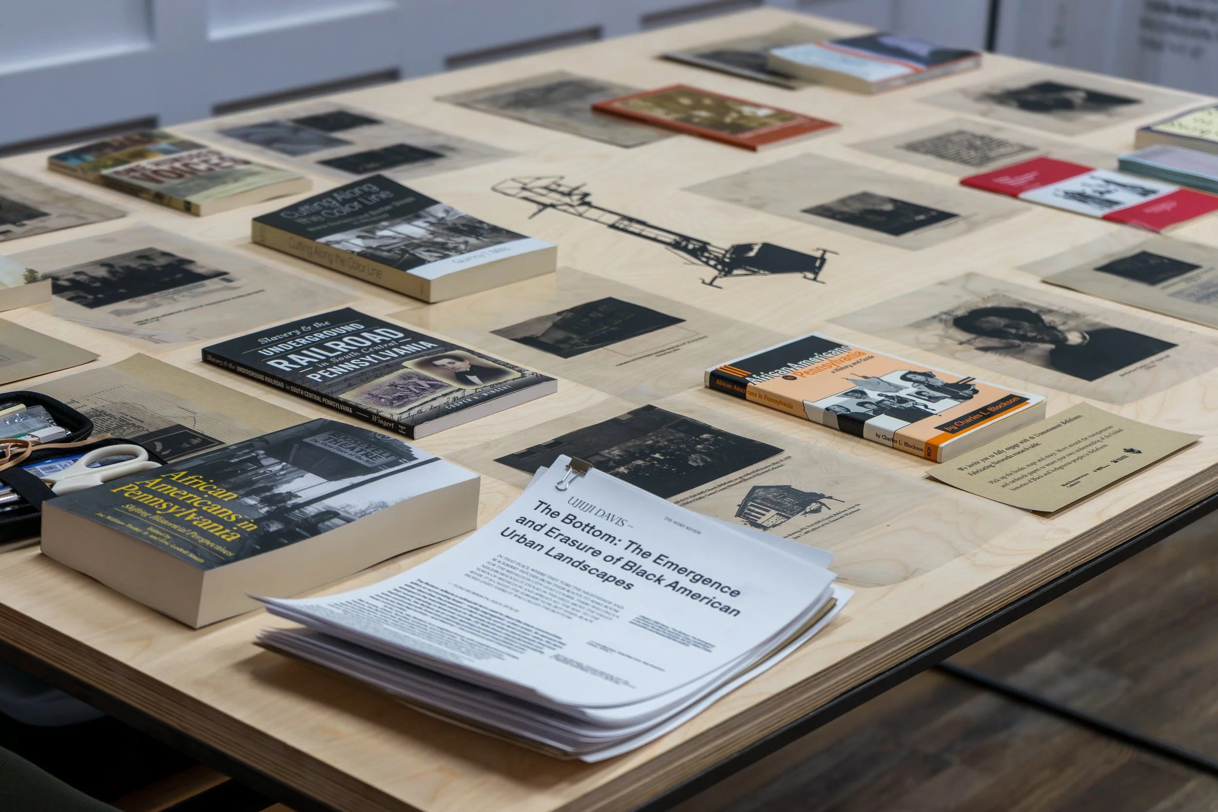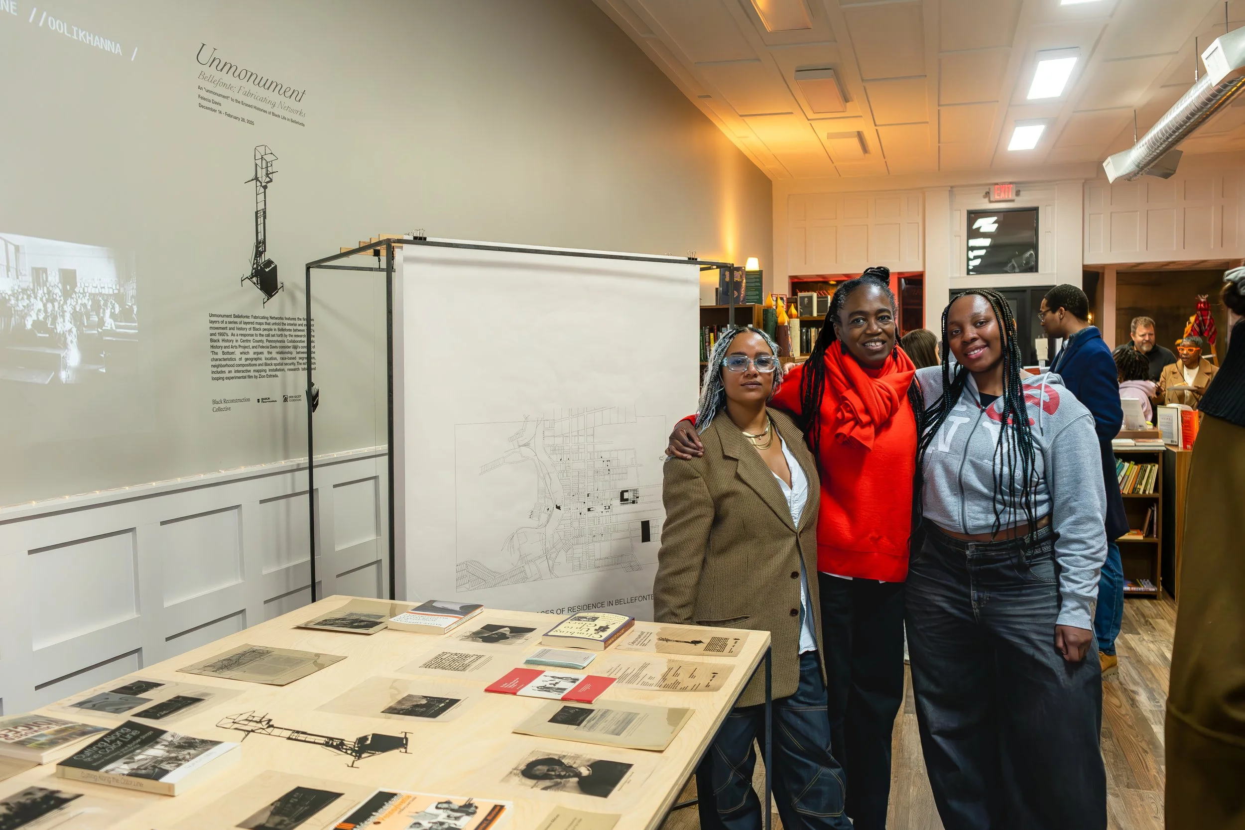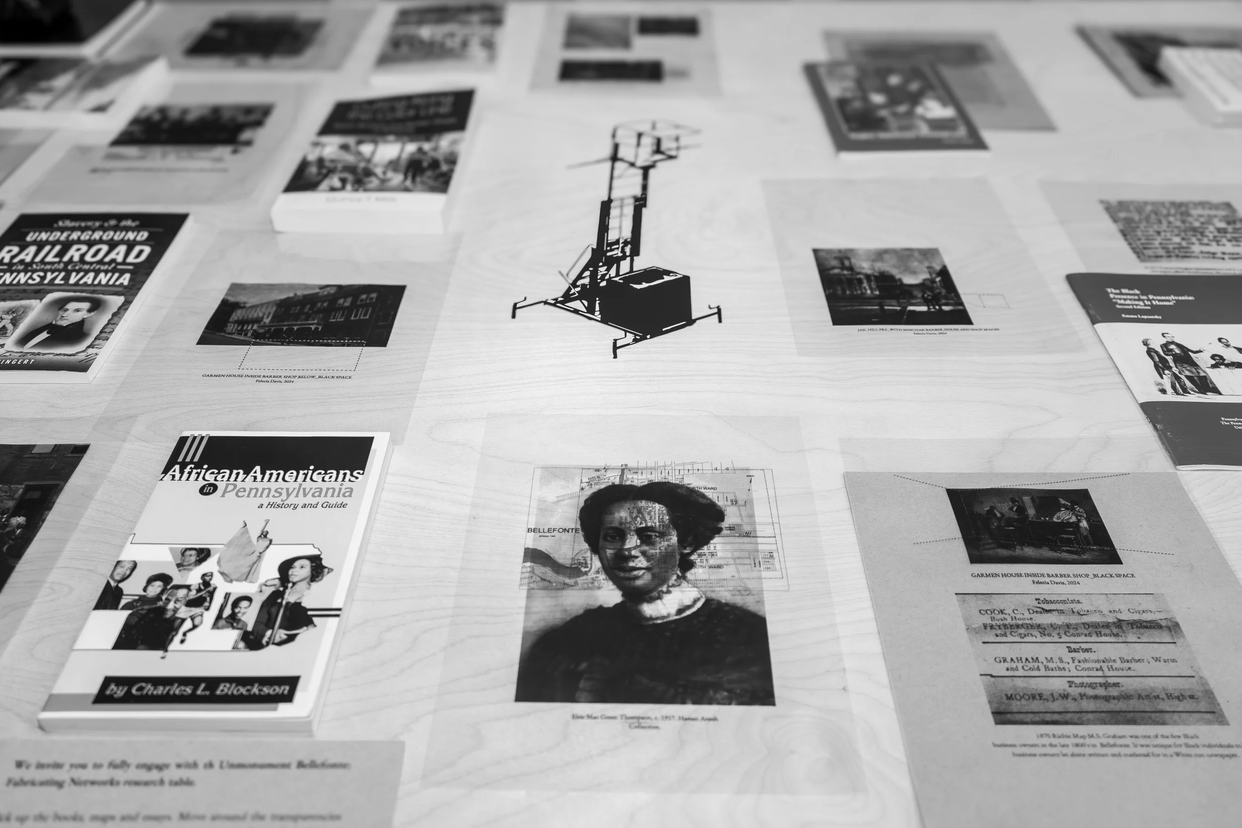 Unmonument Bellefonte: Fabricating Networks, the third iteration of the Unmonument traveling installation, is a continuation of the work related to BRC Founder Felecia Davis’ “Fabricating Networks” installation at MoMA in 2021 as part of the “Reconstructions: Architecture and Blackness in America” exhibit. A response to the call set forth by the research of the Black History in Centre County, Pennsylvania Collaborative Public History and Arts Project, the exhibition explores the lives of Black communities within Bellefonte, PA. Featuring scholarly works by collaborators Philip Ruth and Racine Amos, the fabrications consist of a series of layered maps of movement and history. These maps enclose both interior and exterior spaces between the 1800s and today.