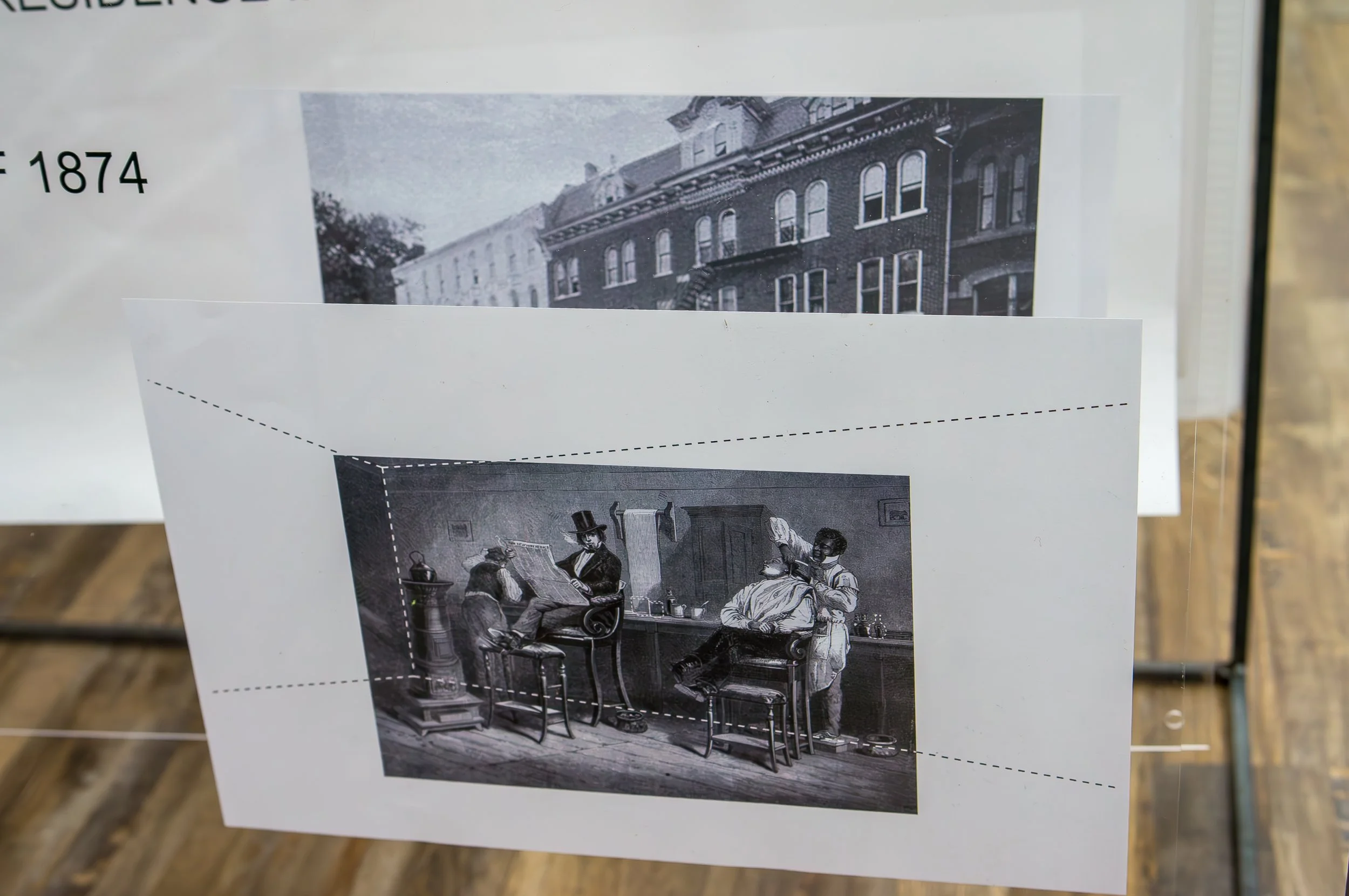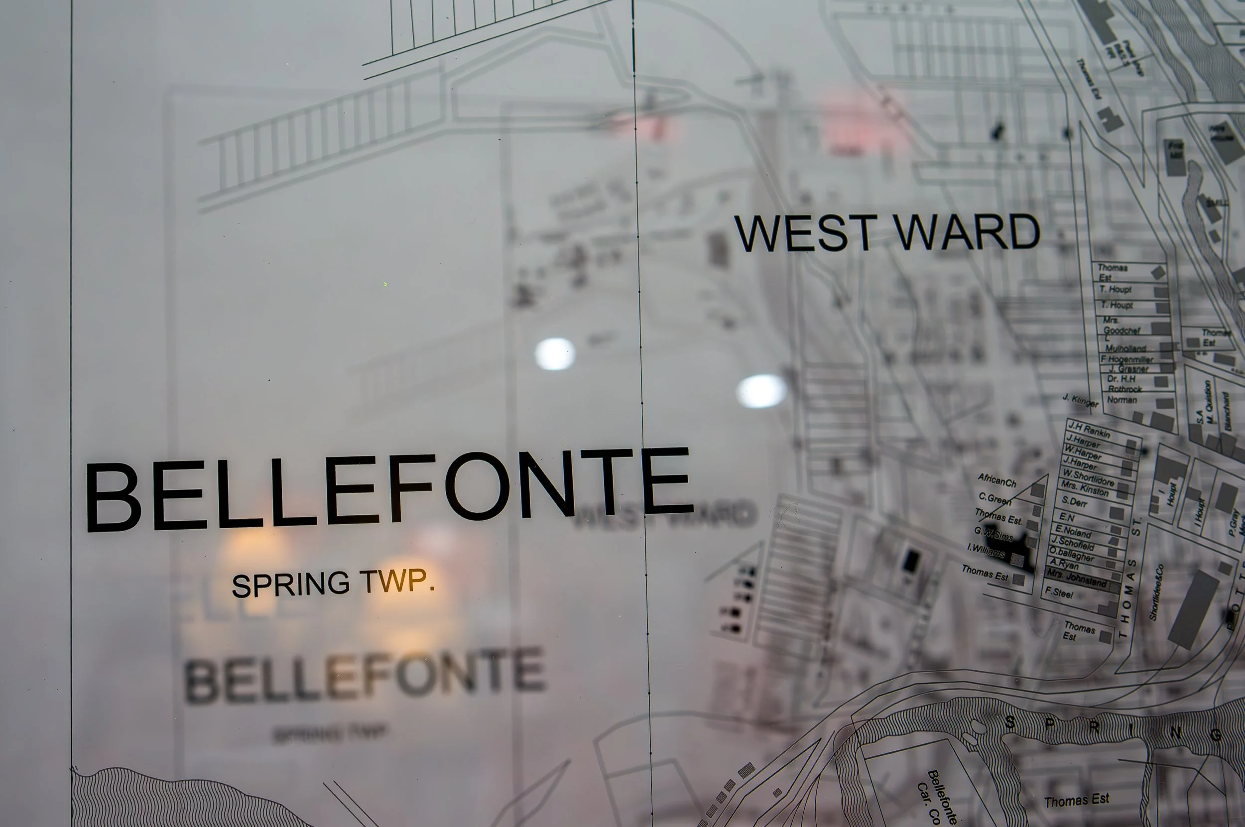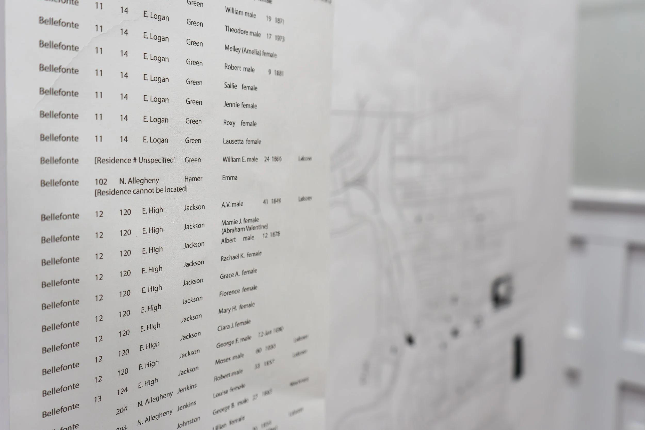 Unmonument Bellefonte: Fabricating Networks, the third iteration of the Unmonument traveling installation, is a continuation of the work related to BRC Founder Felecia Davis’ “Fabricating Networks” installation at MoMA in 2021 as part of the “Reconstructions: Architecture and Blackness in America” exhibit. A response to the call set forth by the research of the Black History in Centre County, Pennsylvania Collaborative Public History and Arts Project, the exhibition explores the lives of Black communities within Bellefonte, PA. Featuring scholarly works by collaborators Philip Ruth and Racine Amos, the fabrications consist of a series of layered maps of movement and history. These maps enclose both interior and exterior spaces between the 1800s and today.