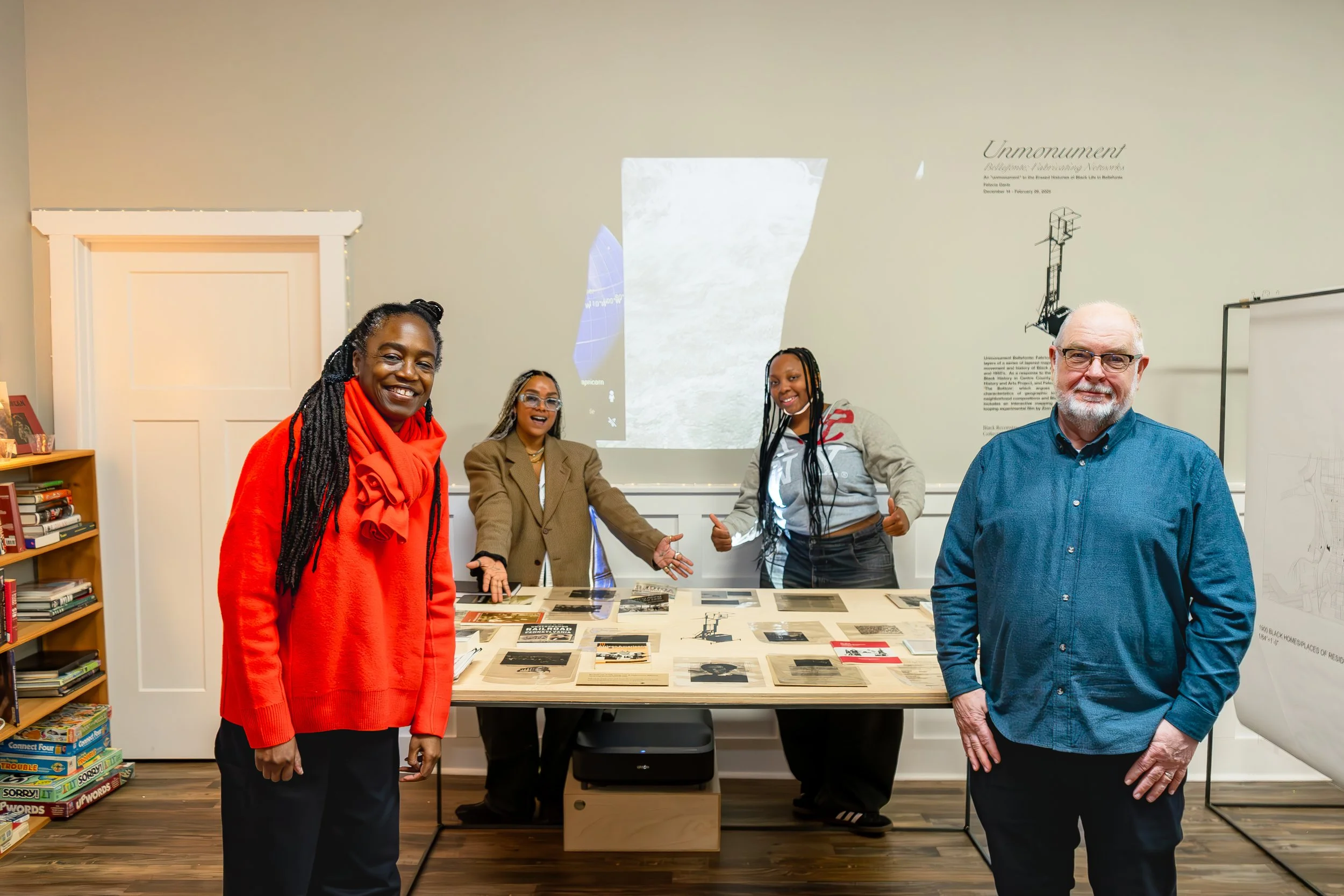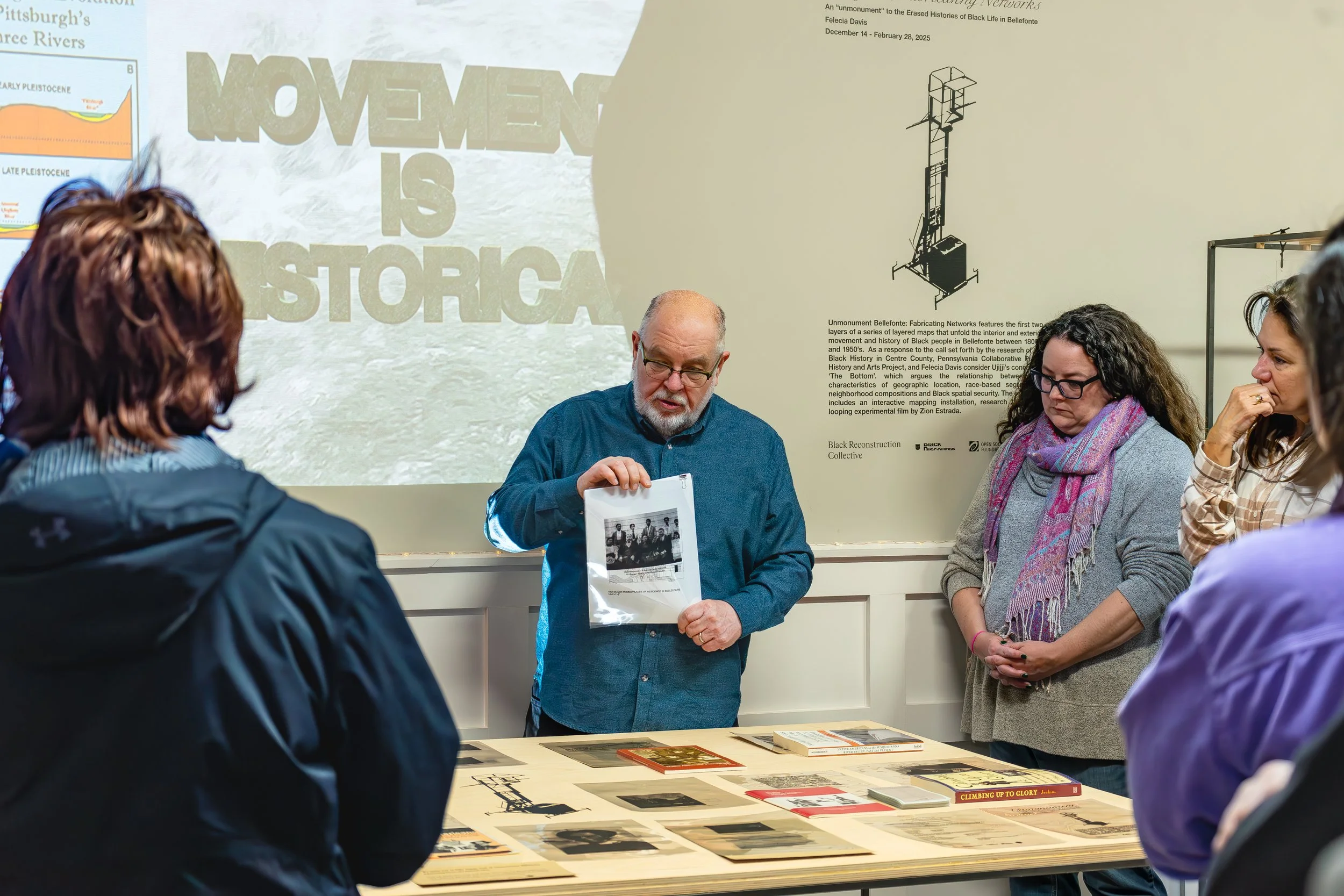 Unmonument Bellefonte: Fabricating Networks is hosted at Bellefonte’s burgeoning community space, The Print Factory, and curated by Black Discourse. The exhibition opened to the public on Saturday, December 14 at the Print Factory (130 S Allegheny Street, Bellefonte, PA 16823) with programming, including a film screening and panel discussing the history of Black movement in Bellefonte, exposing networks of lost narratives about people and their relationship to the land. The exhibition will be on view through February 28, 2025.
